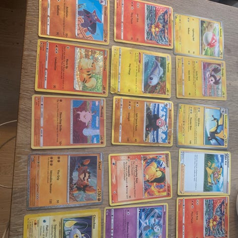 Pokémon samlekort blandet lot. Kortene omfatter forskellige Pokémon-figurer i både vand-, plante- og andre typer. Motiverne inkluderer blandt andet Magikarp, Venusaur og Blastoise samt flere andre Pokémon-kort i en mappe. Bagsiderne viser standard Pokémon-design. Velegnet til samlere af Pokémon TCG, som ønsker et udvalg af forskellige kort i én samlet pakke.