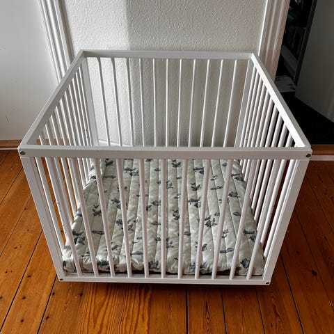 BabyDan kravlegård i hvidmalet træ. Kravlegården har tremmesider hele vejen rundt, madrassen kan evt købes med ved aftale