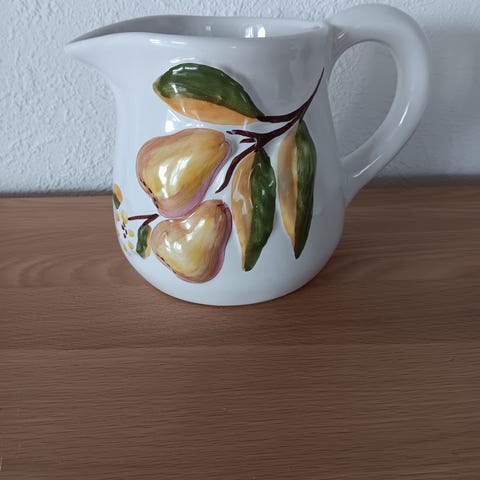 Porcelænskande i hvid med guldfarvede dekorationer langs kant, krop og fod. Kanden har klassisk buet form med hank og hældetud. På billederne ses slitage og skader ved kanten, som bør bemærkes. Højde 22 cm