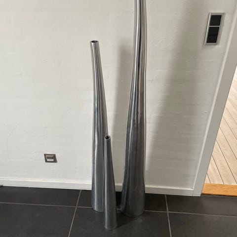 Dekorationsvaser i sølvfarvet metal. Sæt af slanke, organiske vaser med blank overflade. Velegnet som bord- eller gulvdekoration, enten enkeltvis eller samlet som gruppe. Kan anvendes til afskårne blomster, grene eller som rene pyntegenstande i stue, entré eller andre rum i hjemmet.