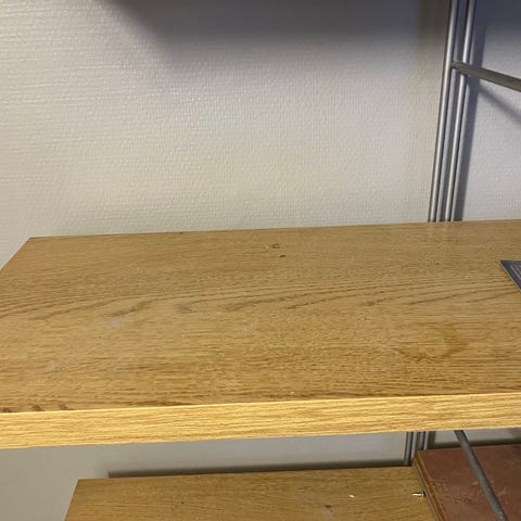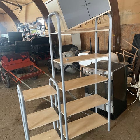 Reolen er skilt ad men alle dele er der . Hylderne er en smule bøjet og trænger til en gang maling