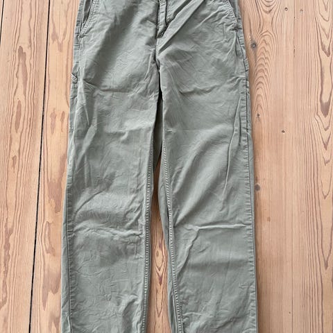 Carhartt bukser i khaki denim til damer. Bukserne er i str. M med taljemål W30. Modellen har afslappet, lige pasform med bæltestropper i taljen. Klassisk femlommers-inspireret design med ekstra baglommer og sidelommer. Velegnet til hverdagsbrug og fritid.