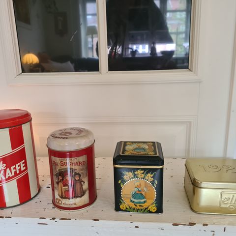 Nogle af dåserne er lidt bulet. Den lille No-name med blomster er lidt rusten. Nogle mangler låg.