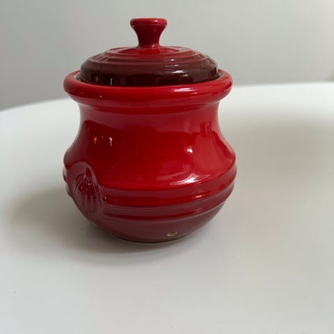 Le Creuset krukke sæt i cremefarvet stentøj til løg og kartofler.