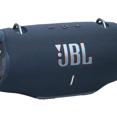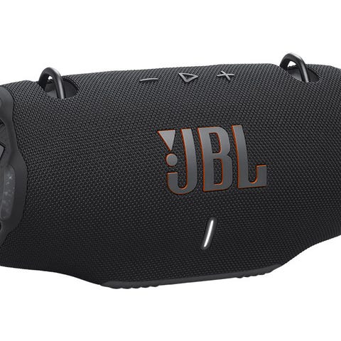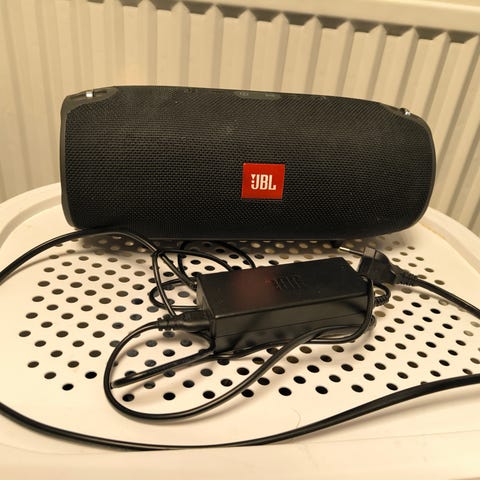 JBL bærbar højttaler i sort med guld-detaljer. Kompakt rektangulært design med bærehåndtag. Fronten har kvadratisk mønstret gitter, og bagsiden har tilslutninger til strøm og kabel. Egnet til brug som transportabel højttaler i hjemmet eller på farten, hvor der er behov for en mindre, stationær enhed med nettilslutning.