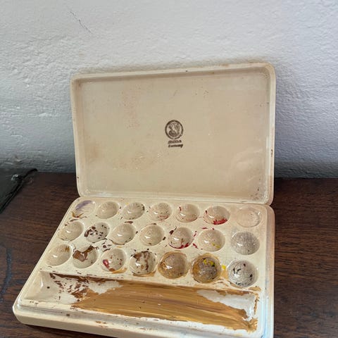 Porcelænsmaleri sæt i trækasse med forskellige farvepigmenter i små glas- og plastbeholdere. Sættet indeholder flere nuancer, bl.a. mærket som porcelænfarve og med tyske farvebetegnelser. I kassen er der desuden mindre tilbehør som saks og små æsker med farver. Egnet til porcelænsmaling eller som samlerobjekt for ældre kunst- og hobbyudstyr.