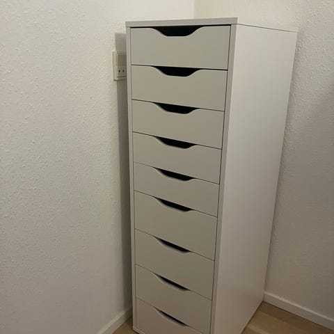 IKEA kommode og natborde i mørk træfinish. Kommoden har flere skuffer på forsiden, velegnet til opbevaring af tøj eller andre genstande. Natbordene har en lille skuffe øverst og en åben hylde nederst, som giver ekstra opbevaringsplads ved siden af seng eller sofa. Sættet passer til soveværelse eller andre rum, hvor der er behov for praktisk opbevaring og en ensartet stil.