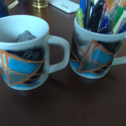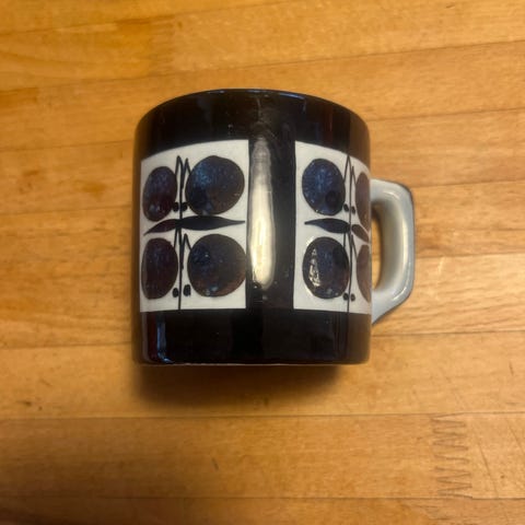 Royal Copenhagen krus i fajance med grafisk dekoration i sort og orange på hvid bund. Kruset har hank og trykte mærker under bunden, herunder Royal Copenhagen stempel og formnummer 3495. Velegnet til fx kaffe, te eller andre varme drikke.