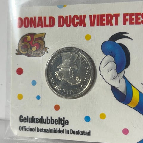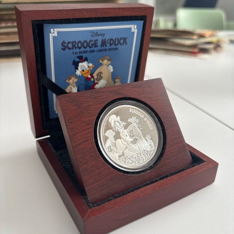 Disney Donald Duck samlermønt i guldfarvet metal. Mønten leveres i en gennemsigtig plastæske med blå indsats, som beskytter og præsenterer mønten. Motivet viser Onkel Joakim på forsiden omgivet af stjerner. Velegnet som samlerobjekt eller som del af en Disney- eller tegneseriesamling.