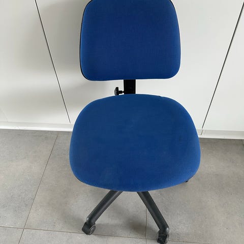 Blå kontorstol betrukket med blåt kunststof. Kan indstilles. Afhentes