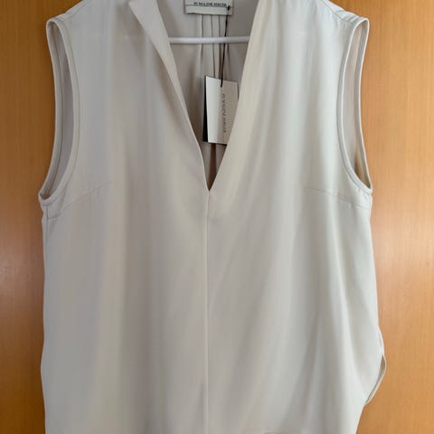 By Malene Birger top i sort i størrelse 40. Toppen har et let skinnende, meleret materiale og er ærmeløs med rund hals. Velegnet til brug både til hverdag og mere formelle anledninger afhængigt af styling.
