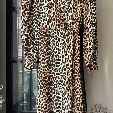 Ganni slå om kjole i leopardmønstret brun nuance i størrelse 40. Kjolen har korte ærmer med sort blondedetalje og bindebånd i taljen. Let, vævet materiale, egnet som kjole til hverdag eller fest afhængigt af styling.