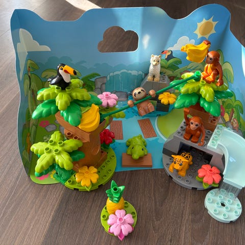 LEGO DUPLO: Toy Story, Disney Belles balsal, brandbilsæt, space shuttle mission, submarine adventure, camping adventure - samt diverse dyr - landbrug, skov, savanne og djungel. Endvidere er der køretøjer og et par hundrede klodser i alle slags farver.