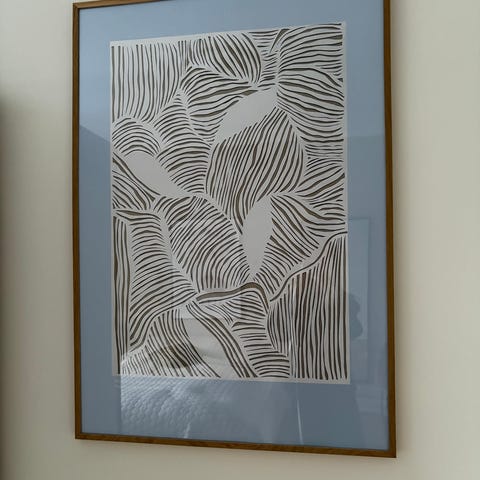 Plakat med enkel line art-tegning af en menneskefigur. Motivet er holdt i sort streg på lys baggrund. Billedet er indrammet i en ramme med trælook. Velegnet som vægdekoration i stue, soveværelse eller kontor.
