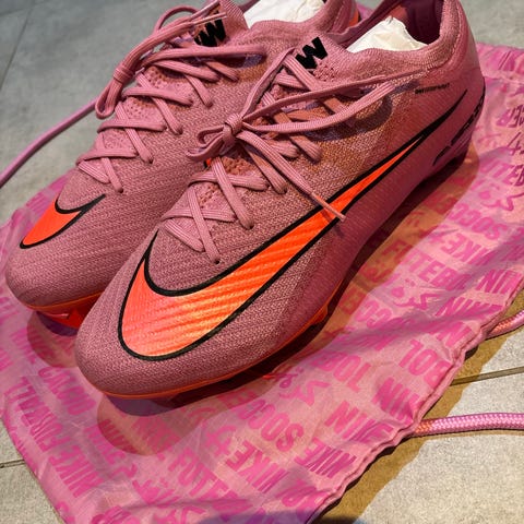 Nike Air Zoom Mercurial Vapor 16 Elite FG fodboldstøvler i pink farve. Modellen er beregnet til fast græs (FG) med faste knopper under sålen. Overdelen er i syntetisk materiale med Nike-logo i kontrastfarve. Skoene leveres med matchende pink støvlepose med Nike-tryk. Velegnet som letvægts fodboldstøvle til spil på naturgræsbaner.