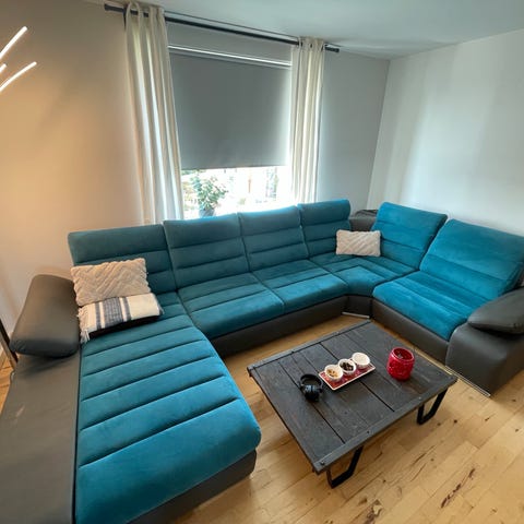 Sælger denne flotte og komfortable L sofa i turkis/indigo blå velour. Sofaen kan laves om til sovesofa og har opbevaringsrum på begge sider, perfekt til dyner, puder eller alt det man ikke gider se liggende fremme.