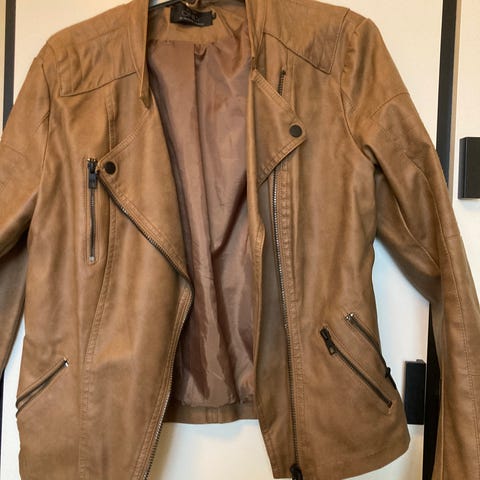 jakke t i brun farve i størrelse L (EU 40/42). Jakken har krave, gennemgående lynlås foran og sidelommer. Materialet fremstår som imiteret læder med glat overflade og foret inderside. Egnet som overgangsjakke eller til hverdagsbrug.