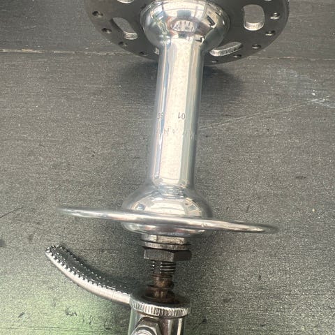 Fornav til cykel i sølvfarvet aluminium. Navet har flanger med huller til eger og gennemgående aksel med møtrikker i begge ender. Egnet til montering i forgaffel på cykel, hvor der ønskes et klassisk aluminiumnav. Mærke og model fremgår ikke tydeligt af billederne.