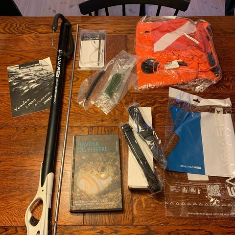 7 mm våddragt med bly, finner, bøje og 2 harpuner og bøje