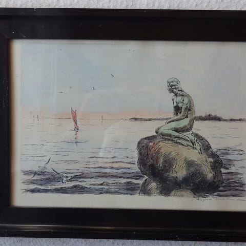 dette maleri er umiddelbart udført af en kunstner der hedder Torkil Glitre. Malet i 1957. Bagpå er der lidt underligt en dødsannonce og så står der: Fødselsdagsgave til Esther.