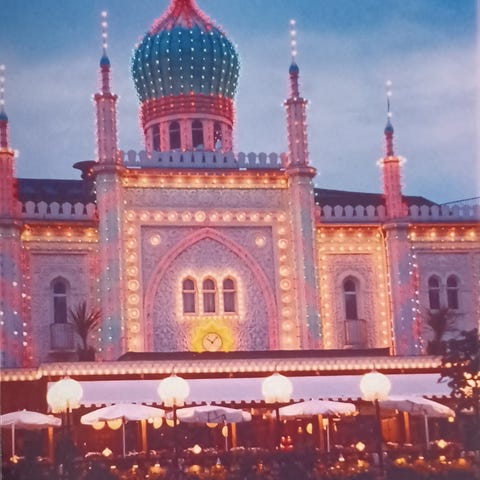 Koncertsalen ved nattetid. Ukendt årstal. Beregnet til at sætte i glas og ramme.