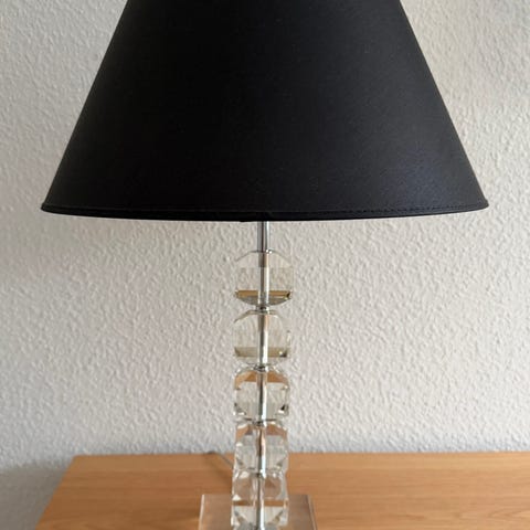 Jotex flot massiv gennemsigtig glas bordlampe med hvid lampeskærm og guld detaljer og fin ledning i snoet stof i guld - passer til alle rum og perfekt til stue eller soveværelse