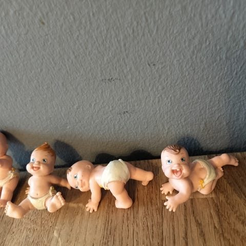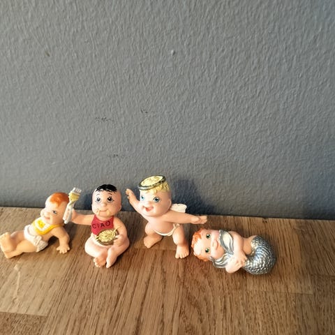 En baby dreng med nøgler, en trold med lilla hår og en havefrue.