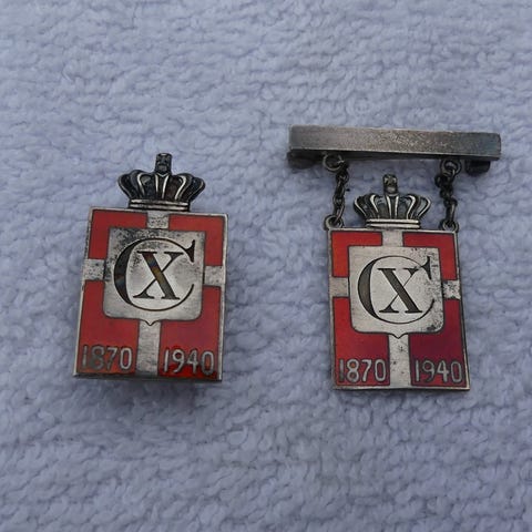 Georg Jensen smykker i sølv til unisex. Smykkerne fremstår som små emblemer eller pins med rektangulær form og røde felter kombineret med sølvfarvede detaljer. Flere af delene har nål på bagsiden, så de kan bæres som broche eller nål på jakke, taske eller som samlerobjekter.