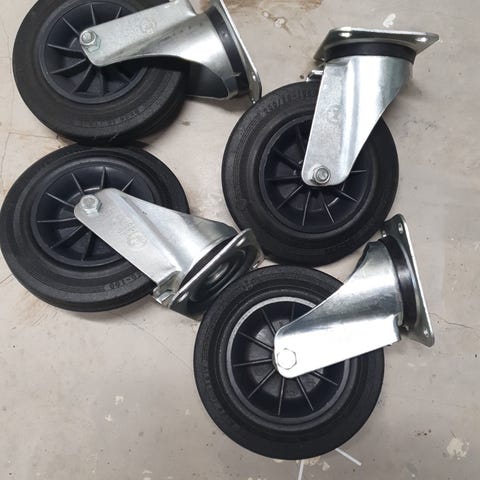 Industrirullehjul i metal med gummibane. Hjulene er monteret på kraftige metalbeslag med plade til fastgørelse. Egnede til brug på vogne, stativer eller andet udstyr, hvor der er behov for robuste transporthjul. Farve hovedsageligt metal med mørk gummikant. Nærmere mål og belastningsevne ikke oplyst.