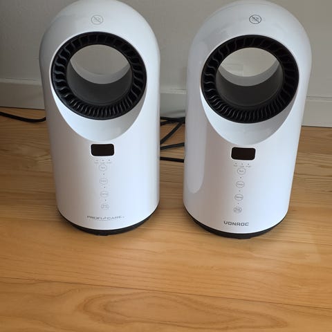 Elektrisk varmeblæser i hvid plast. Kompakt model med bærehåndtag øverst og frontgitter, hvor varmen blæses ud. På fronten er der drejeknapper til regulering af varme og blæserfunktion. Egnet til opvarmning af mindre rum som fx værelser, kontorer eller hobbyrum, hvor der er behov for ekstra varme. Tilsluttes almindelig stikkontakt med ledning bagpå.
