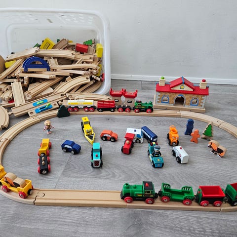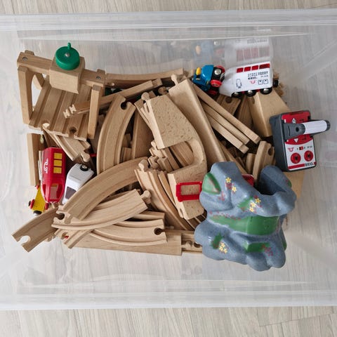BRIO togbane i træ med forskellige skinner og tilbehør. Sættet indeholder buede og lige skinner samt enkelte vej- eller banedele i plast.