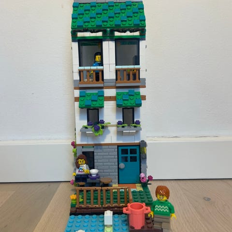 LEGO Creator hus byggesæt. Sættet forestiller et hus med rødt tag, hvid facade, have med hegn, indkørsel og lille træ. Modellen er bygget på grønne baseplader og indeholder detaljer som skorsten, blomsterbede og indgangsparti. Egnet til leg og opbygning af bymiljøer sammen med andre LEGO Creator sæt. Der er hvad du ser.