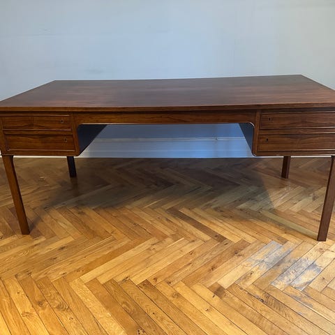 Dejligt Bord med en stor låge og dybe skuffer i siden.