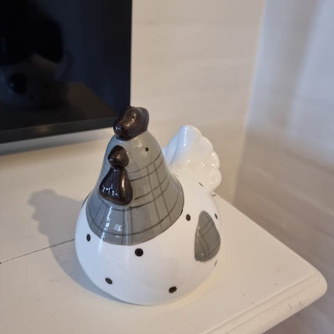 Lågkrukke udformet som høne i hvid/blå porcelæn. 18x23 cm, højde 9 cm u låg, 17 cm incl. låg.