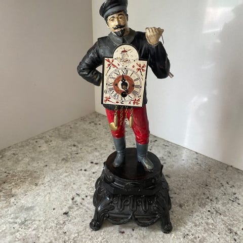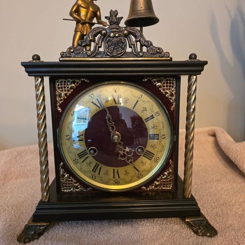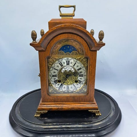 MacKenzie Childstyle bordurur bordsklok med håndmalet kunstværk i MacKenzie Childstyle, mekanisk 8-dages urværk, slå-ved-halvtime med klokke, træhus med kobber og messing detaljer, oprindelse Europa, i funktion, 21 cm høj, 37 cm bred, 15 cm dyb, vægt 2380 g, med optræksnøgle, ca. 1940–1950. Klik på den blå "gå til varen" knap, for at købe eller byde på denne vare. Den samlede pris vil blive vist inden du afgiver dit bud.