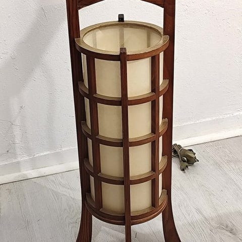 En vintage-inspireret brun trægulvlampe, 140 cm høj med firkantet fod på 28 cm, mørk patina og brunt velourskærm, E27-fatning, én enhed, oprindelse Indien, dateret til 1960–1970, i god drift med mindre alderstegn. Klik på den blå "gå til varen" knap, for at købe eller byde på denne vare. Den samlede pris vil blive vist inden du afgiver dit bud.