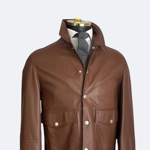 Herrebrun læderjakke med fjerfyld, størrelse M, fremstillet i Italien, ny og ubrugt. Klik på den blå "gå til varen" knap, for at købe eller byde på denne vare. Den samlede pris vil blive vist inden du afgiver dit bud.