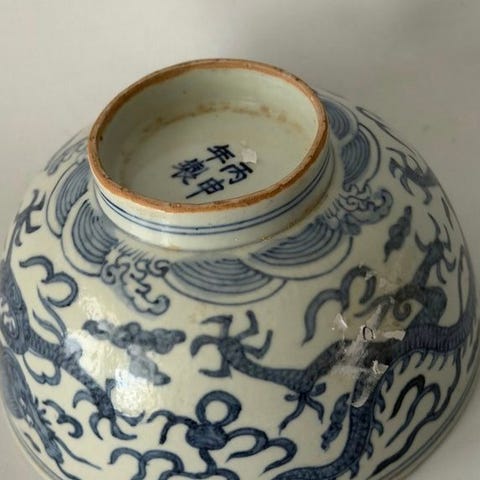 En fejl i kanten, nogle små afskalling polerede i kanten eller manglende glasur, og glasurkrakninger i porcelænen (Adskillige detaljerede fotos)