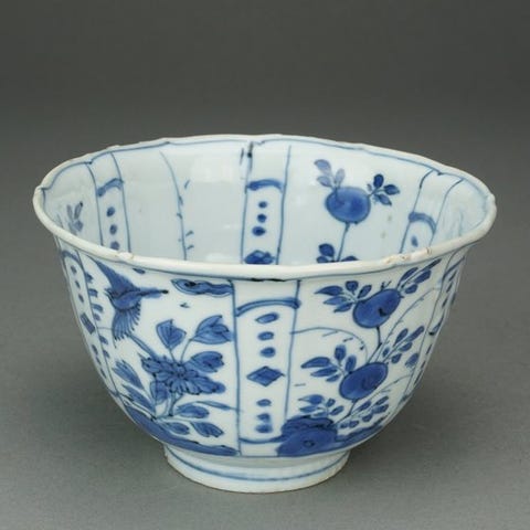 En porcelæns-skål fra overgangsperioden i sen Ming-dynastien, med titel Bowl, tilskrevet Shou – Longevity, højde 9,6 cm og bredde 22,6 cm, Kina, i god stand. Klik på den blå "gå til varen" knap, for at købe eller byde på denne vare. Den samlede pris vil blive vist inden du afgiver dit bud.