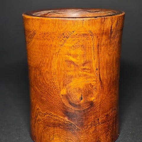 Et fint udskåret trækubuvævet cylindrisk kar fra det 19. til 20. århundrede. Stykket har en aftagelig låg udskåret af gultonede træ. Kroppen er udført i et detaljeret åbent arbejde, dekorativt med lykkebringende skyer og chilong-designs.