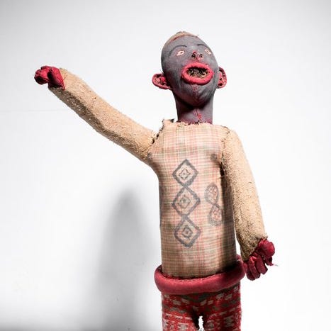 Figur-Puppe af Fali fra Cameroun, lavet af træ, glas, læder og bronze med kauri-skal og perler, højde 28 cm, bredde 12 cm, dybde 11 cm, leveres med stand og er i rimelig stand. Klik på den blå "gå til varen" knap, for at købe eller byde på denne vare. Den samlede pris vil blive vist inden du afgiver dit bud.