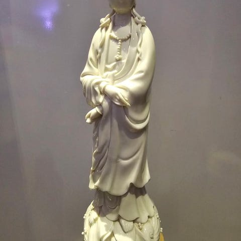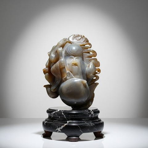 Kinesisk skulptur fra det 20. århundrede, Guanyin-figur i agat, sjælden vægt 170,4 g uden sokkel, 267,9 g med sokkel i træ, højde 14 cm med sokkel, 11 cm uden sokkel, meget smuk stykke
