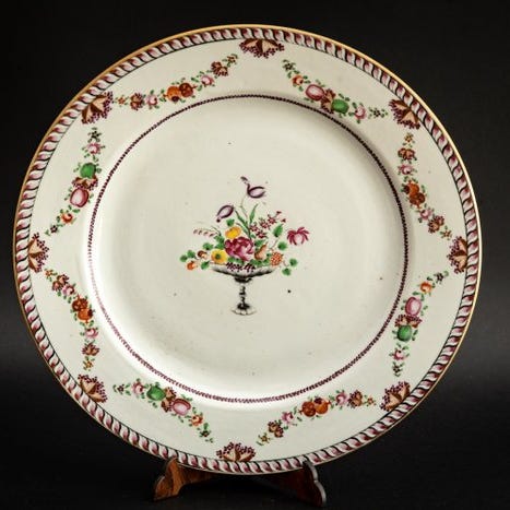 Et kinesisk porcelænsfat i famille rose, dekoreret med en fawn? Phoenix og en drage der jager en flammende perle i midten.