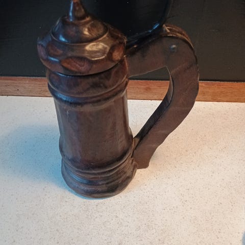Træårene viser tydelige mønstre og knuder, hvilket giver hele stykket et unikt udseende. Indersiden er også håndbearbejdet. Bundens overflat er udskiftet? (I'll correct)