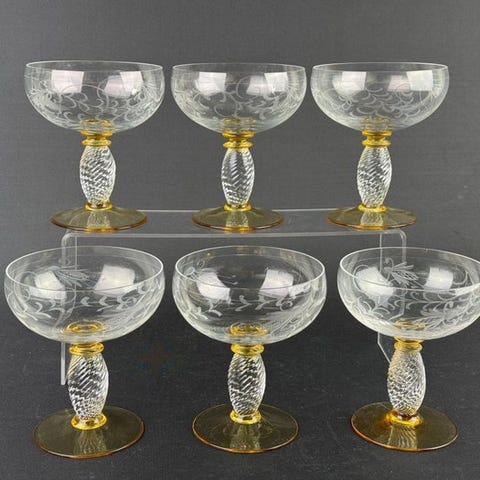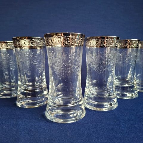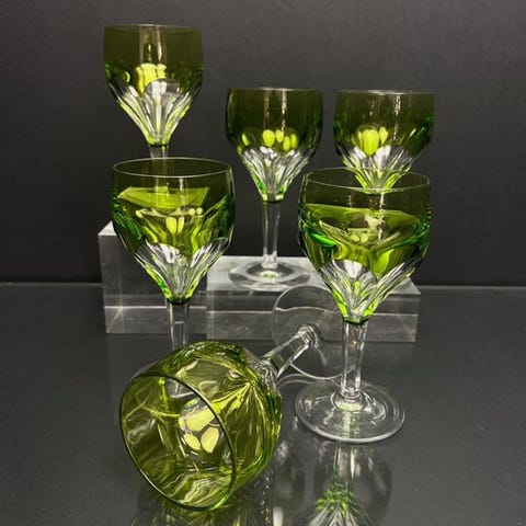 Disse glas er lavet af ægte urankrystal, et materiale som i periodens europæiske krystalproduktion bredt blev anvendt for at opnå den særegne lysende grønne farve. Under ultraviolet (UV) lys udviser glassene en
