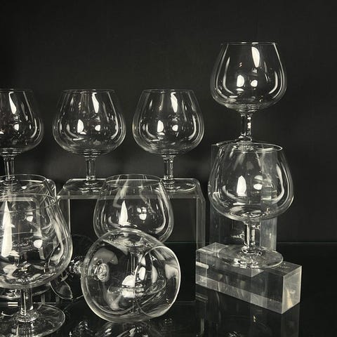 Et sjældent og elegant sæt af tolv urankrystal-likør- og vinglas, fremstillet i Belgien eller Nederlandene i slutningen af 1800-tallet til begyndelsen af 1900-tallet (ca. 1890–1910).