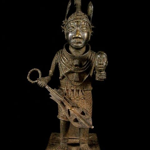 Rammen står i Benin for maskulinitet, men også for udholdenhed, og blev traditionelt ofret ved Ague-ceremonien. Replika. Oba Esigie.