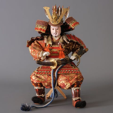 Original suji’bachi kabuto hjelm med rygge, sort lakering med guldaccenter og maedate i guldfoliek formet som et eget løv, 8-plade skål, 5-trins tehen’no’kanamono, fukigaeshi, shikoro i navy-blå silke, fra Japan i 1800-tallet (sen Edo/Meiji), højdemål 40 cm, bredde 32 cm, dybde 29 cm, vægt 1,7 kg, i god stand med ældre restaureringer på maedate, certifikat for ægthed medfølger ved afsendelse. Klik på den blå "gå til varen" knap, for at købe eller byde på denne vare. Den samlede pris vil blive vist inden du afgiver dit bud.