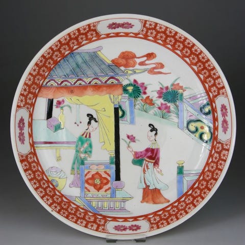 18. århundredes kinesisk porcelænsfad i Famille Verte stil, dekoreret med blomster og en fugl, diameter 22,5 cm, højde 4,5 cm, i meget god stand med let slid på dekorationen og en næsten usynlig, hår-nål-linieres reparationss. Klik på den blå "gå til varen" knap, for at købe eller byde på denne vare. Den samlede pris vil blive vist inden du afgiver dit bud.