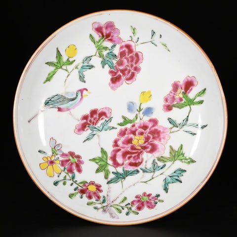 En fantastisk og meget sjælden tallerken af kinesisk porcelæn fra det 18. århundrede. Fremstillet og håndmalet med glasurerne fra Famille Verte, dekoreret med blomster og en fugl. Med en farvekombination, der giver den en vis skønhed. Qianlong-perioden. Diameter: 22,5 cm.